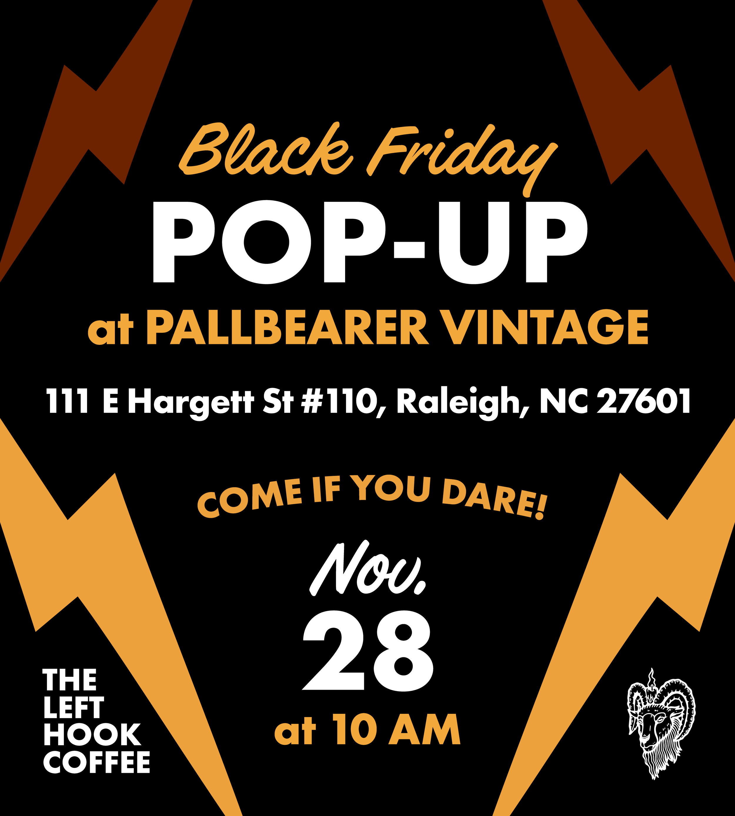 POP-UP! Black Friday at Pallbearer Vintage Friday, November 28, 2025 10:00 AM 12:00 PM Pallbearer Vintage 111 E Hargett St. Raleigh, NC, 27603 United States (map) Google Calendar ICS COME IF YOU DARE!We’re popping up WITH OUR FRIENDS at pallbearer vintage (111 E Hargett St #110, Raleigh, NC 27601). NOW THAT’s WHAT WE CALL A DEAL! COME HAVE SOME COFFEE AND CHECK OUT THEIR STORE… IF YOU DARE.